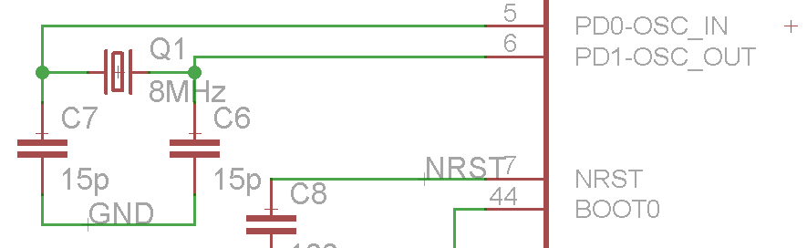Man darf nicht alles glauben, was die Hersteller schreiben. Die AN2867 von ST ist zwar eine der besseren zur Dimensionierung von Quarzoszillatoren, aber bei Rs schreiben sie Unfug: 4.4.3: "An initial estimation of R Ext is obtained by considering the voltage divider formed by Rext/CL2" Der Serienwiderstand wirkt bei der Oszillatorfrequenz nicht gegen Cl sondern gegen die vom ESR verursachten Verluste! Weiter oben (4.3) berechnen sie ja gmcrit sinnvoll. Mit 100Ohm, 8MHz und 2x15pF ergibt das: 4*(2*Pi*8MHz*15pF)^2*100Ohm = 227uS entspricht 4400Ohm Das heißt: Wenn ich auf das C-Q-C-Netzwerk schaue, hat es bei 8MHz eine reelle Impedanz von 4k4 gegen Masse. Mit einem Serienwiderstand von 4,4kOhm halbiere ich also etwa die Amplitude am C-Q-C-Netzwerk. Die von 6A66 genannten 220R ändern die Amplitude der Grundfrequenz nicht merklich und helfen dem OP voraussichtlich nicht. Nützlich ist so ein niederohmiger Serienwiderstand jedoch gegen Oberwellen (Störaussendung). Servus Oliver