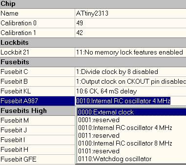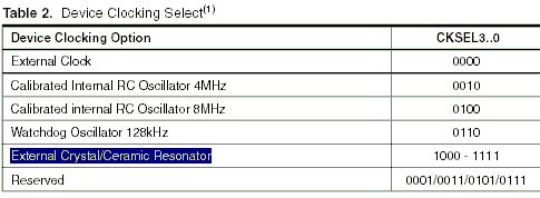 Hi alle, habe BASCOM, letzte DEMO 1.11.7.9, in Verbindung mit ATTiny2313 und möchte einen SMD Ceramic Resonator einsetzen. Wie muss ich die Fuses setzen? 1000-1111 sind in BASCOM nicht möglich. Dort kann ich nur 0000-0110 auwählen. Das Einstellen auf 0000:External clock funktioniert nicht! Hat BASCOM hier einen Fehler und unterstüzt die Ceramic Resonator nicht? mfg Kalle