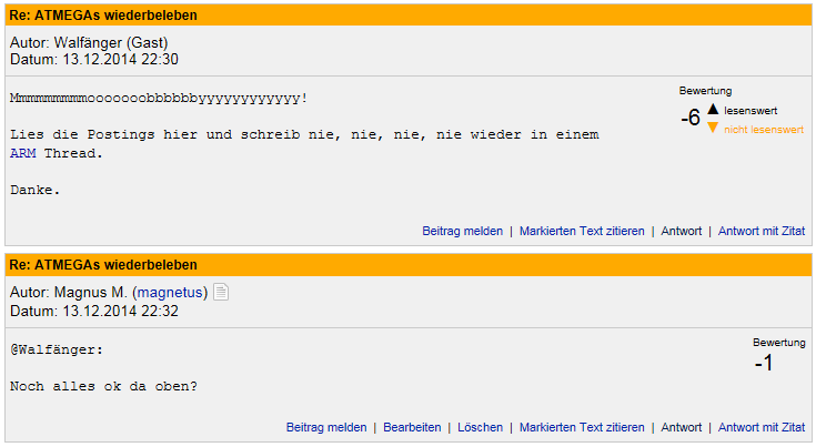 [OT] Walfänger schrieb im Beitrag #3923151: > Mmmmmmmmmooooooobbbbbbyyyyyyyyyyyy! > > Lies die Postings hier und schreib nie, nie, nie, nie wieder in einem > ARM Thread. > > Danke. Magnus M. schrieb im Beitrag #3923154: > @Walfänger: > > Noch alles ok da oben? Es kotzt mich an wenn hier registrierte Hirnspacken unterwegs sind, die anonym als Gast herum trollen und sich nur zwecks Abgabe einer negativen Bewertung kurz einloggen. [/OT]