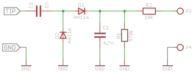 ich krieg grad die Krise: Demodulator-Tastkopf Platine geätzt, aufgebaut, und funktioniert genau überhaupt nicht :-( Schaltung in LTSpice simuliert - Ergebnis entsprecht dem was ich messe. Über dem Eingangs-C baut sich genau jene DC-Spannung auf (aber mit umgekehrter Polarität), die ich am Ausgang gerne messen würde :-( Je mehr ich darüber nachdenke, um so logischer. Ohne die Diode gegen Masse kann das nicht funktionieren... Meine Schaltung oben. Matthias, magst du da noch mal drüberschauen?