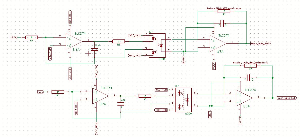 Musst Du auf Gewalt Dein Budget verbrauchen ? TCL274 = PRECISION QUAD OPERATIONAL AMPLIFIERS IL300 = High Gain Wide Bandwidth Linear Du musst doch nur die Optokoppler direkt (mit R) an den MCU pin legen. Die brauchen doch nur ein paar mA. Warum IL300 und nicht Transistor Koppler oder gleich mit Logig Ausgang ? Die H11L1, mal willkürlich bei mouser rausgesucht, können 1Mhz und haben gleich alles drin was Du zur Siglanaufbereituung brauchst. SDA, SCL ... I2C ist bidirektional, das ist Dir schon klar, oder ?