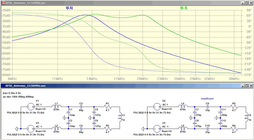 > Da dies ja ein symmetrisches System ist, habe ich es bei> LT-Spice sowohl symmetrisch, als auch unsymmetrisch, also> nur mit einer Seite und dementsprechend der „halben“> Antenne (Induktivität) simuliert. Kann ich das Problem> nur auf eine Seite vereinfachen?