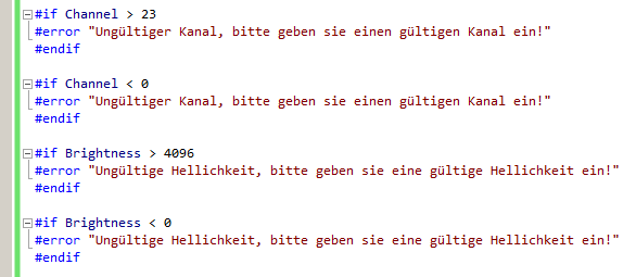 Christian Karle schrieb: > Ja, ich rufe die Methode in der Main-Methode auf, gleich am > Anfang. Dann gebe ich zum Beispiel 5000 für Brightness ein und 50 für > Channel. Nein, das sind Variablen und der Präprozessor kennt den Wert nicht. Den Inhalt von Variablen kannst du erst zur Laufzeit überprüfen.