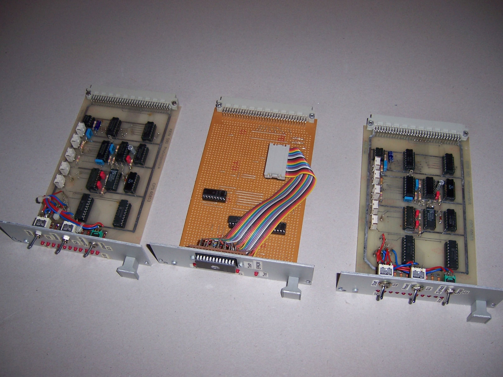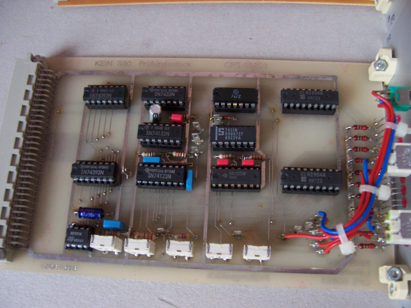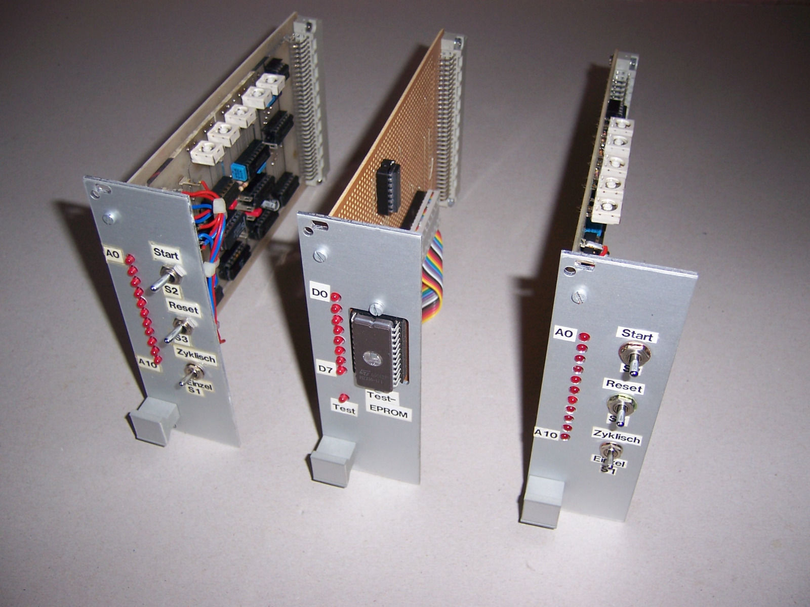 Siehe Bilder. Die Baugruppen mit A0-A10 scheinen Binaerzaehler zu sein. Die einzelne vermutlich zum 'Auslesen' eines Eproms, wo die Adressen hoch gezaehlt werden und die Daten über D0-D7 angezeigt werden. Die Zaehlerplatine traegt: CPS 60853 und ZGA 31B als Aufschrift. Und noch 'Kein S90 Prüfungsstück' und IHK Hinweise dazu? Unterlagen? Peter