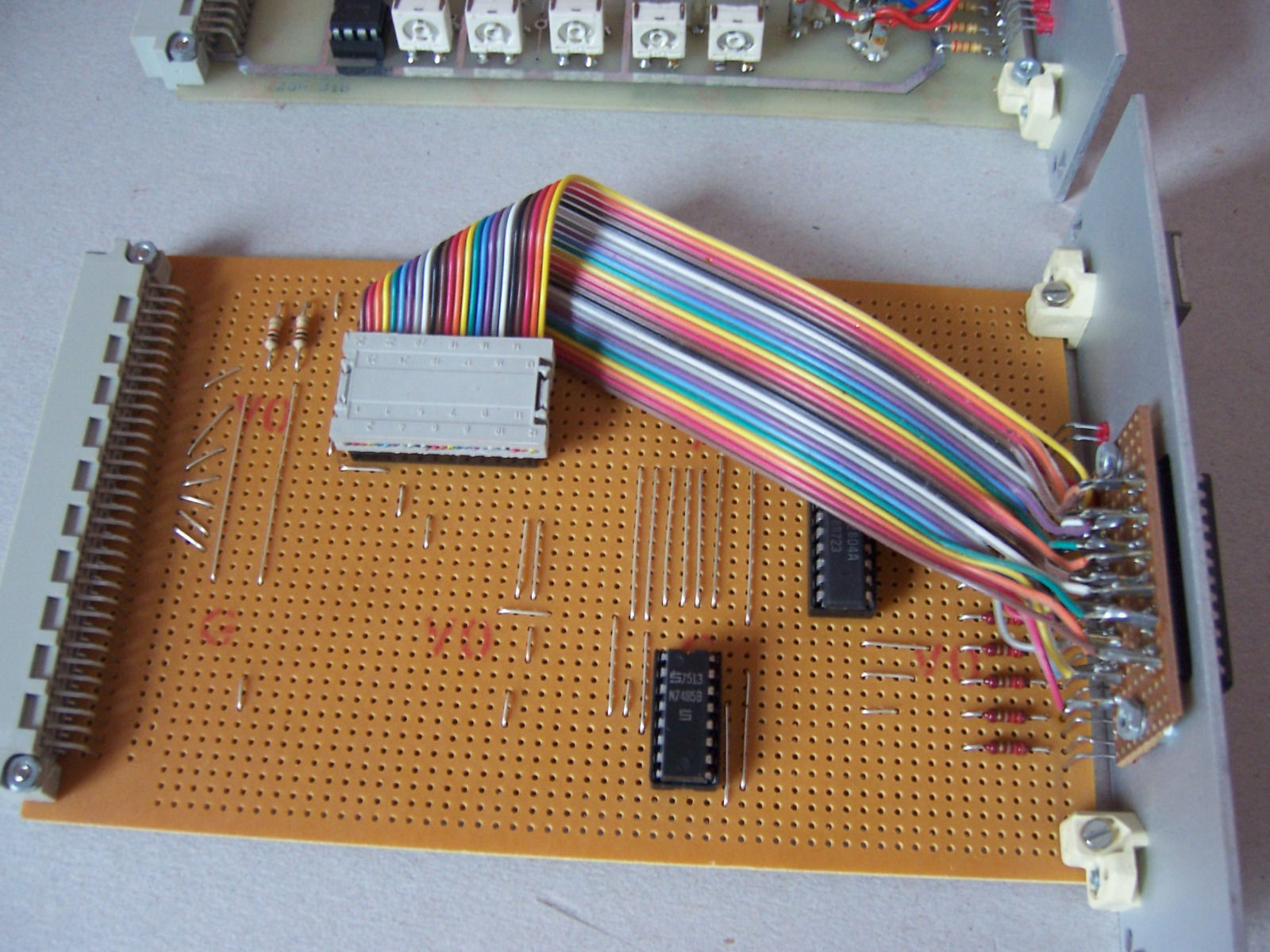 Es dürfte sich um (nachgebaute) Prüfungsplatinen einer IHK Prüfung handeln. Die fertige wurde so geliefert, bzw. vorher gebaut. Die Lochrasterplatine wurde in der Prüfung nach Vorgabe aufgebaut, die leere Platinen dieser Art findet man auch bei Conrad als IHK Platinen. Dann wurde das ganze Zeug Punkt für Punkt in Betrieb genommen und abgeglichen. Daher vermutlich auch 5 Potis an einem digitalen Zähler... Danach wurden Fehler eingebaut, diese musste man suchen. Aktuelle Unterlagen zu einer beispielhaften Prüfung z.B. unter http://www.christiani.de/product_info.php/cPath/55_56_122_10484_10528/products_id/28865 und dem weiterführenden IHK-Link. (Halte ich nicht für Werbung, da das Anwendungsgebiet sehr sehr beschränkt ist) Ich denke sogar das beide Platinen zusammengehören, der Zähler liefert den Adressbus für das EPROM.