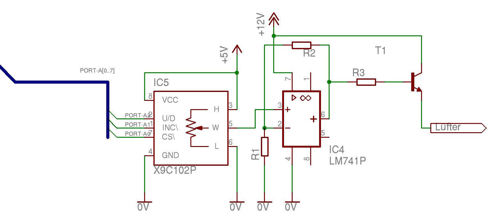 Der 741 wird bei Verstärkungen unter 10 mächig anfangen zu schwingen. (Pin 5,8,1?) Was willst Du mit 50mA Basistrom?!?# Wieviel Strom zieht so ein PC Lüfter, das der Transistor 50mA Basisstrom bräuchte? selbst bei einem halben Ampere (BC639)hast Du mit Sicherheit eine Stromverstärkung von ca.100. Macht dann 5mA oder 10mA Basisstrom, aber nicht 50 oder gar 100mA... Bist Du auf das Digitalpoti angewiesen? der Vorschlag von ad1 ist wesentlich einfacher umzusetzen - kann aber jeder machen, wie er will. Gruß Axel