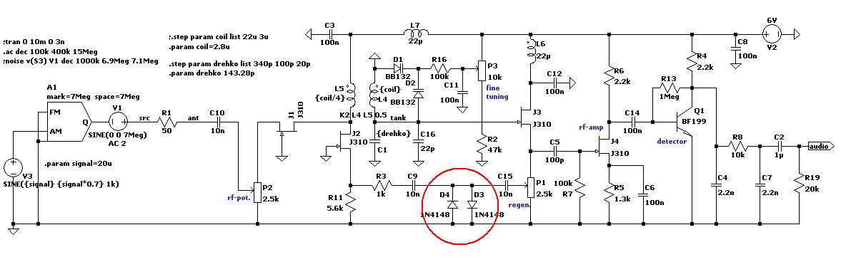 @Dan1el > ob eine solche Diode bei einem Rückkoppel-Audion > ebenfalls einen positiven Effekt haben könnte, > die Überkopplung dosierter eingestellt werden könnte. Normalerweise kann mit Hilfe des Arbeitspunktes erreicht werden, dass in Richtung größerer Amplituden die Verstärkung langsam abnimmt. Das ist Voraussetzung bzw. die erste Wahl für einen weichen Einsatz der Rückkopplung. Kommt man damit nicht hin, z.B. weil die Betriebsspannung nur 1.5V beträgt, kann eine Diode eine leichte Verbesserung bringen. Sie kann auch verhindern, dass beim Überdrehen der Rückkopplung ein paar Volt HF auf die Antenne gelangen, weil sie schon lange vorher begrenzt.