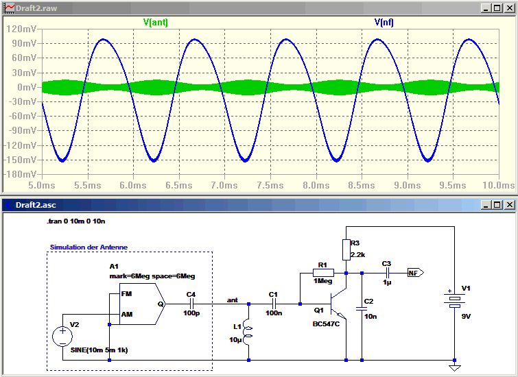 Hallo Umut E. > ich habe diverse kopfhörer und lautsprecher ausprobiert Dem Transistor in Deiner Schaltung fehlt der Basiswiderstand. Der Transistor benötigt einen Ruhestrom, ohne den kann er nicht verstärken. Geeignet sind: - Billige Computer-Aktivboxen - 2x2000 Ohm Detektor-Kopfhörer - hochohmiger Kristall-Ohrhörer - balanced Armature Ohrstöpsel mit Transformator zu Impedanzanpassung Hier steht was zum Thema: http://www.welt-der-alten-radios.de/detektor-hphones-202.html > ist es denn überhaupt möglich so zu empfangen? Das entspricht ungefähr dieser Schaltung: http://www.b-kainka.de/bastel14.htm Mir persönlich gefällt dabei der Arbeitspunkt des Transistors nicht, deshalb sind die beiden Widerstände anders dimensioniert. Mit einer 4-8m langen Antenne sollte nachts der eine oder andere Sender mit ~10mV ankommen. Dies ergibt ein Ausgangssignal von ~100mV, wie man auf der Simulation erkennen kann. Bei mehreren starken Sendern erscheinen diese alle gleichzeitig, denn die Schaltung ist nicht selektiv. So ähnlich funktioniert auch ein Blitzdetektor/Gewitterwarner. Gibt es einen Blitzeinschlag, hört man es kräftig krachen. Blitzentladungen erzeugen ein breitbandiges Spektrum. Empfangssignale sind auch schön auf einem Oszilloskop zu sehen. Dazu muss man den Y-Kanal auf volle Empfindlichkeit stellen. Falls ein Drehkondensator vorhanden ist, dann schalte ihn einfach später als weiteren Versuch parallel zur Rahmenantenne. Damit kann man dann einen Kurzwellenbereich durchstimmen. Frage zur Ermittlung der Spuleninduktivität: Welchen mittleren Durchmesser hat die Rahmenantenne und ca. wieviele Windungen sind drauf. Dann kann man den Frequenzbereich abschätzen. Zur Berechnung nehme ich meist den Mini-Ringkern-Rechner. Der kann auch Luftspulen berechnen: http://www.df7sx.de/?page_id=212 Freundliche Grüße, Bernd