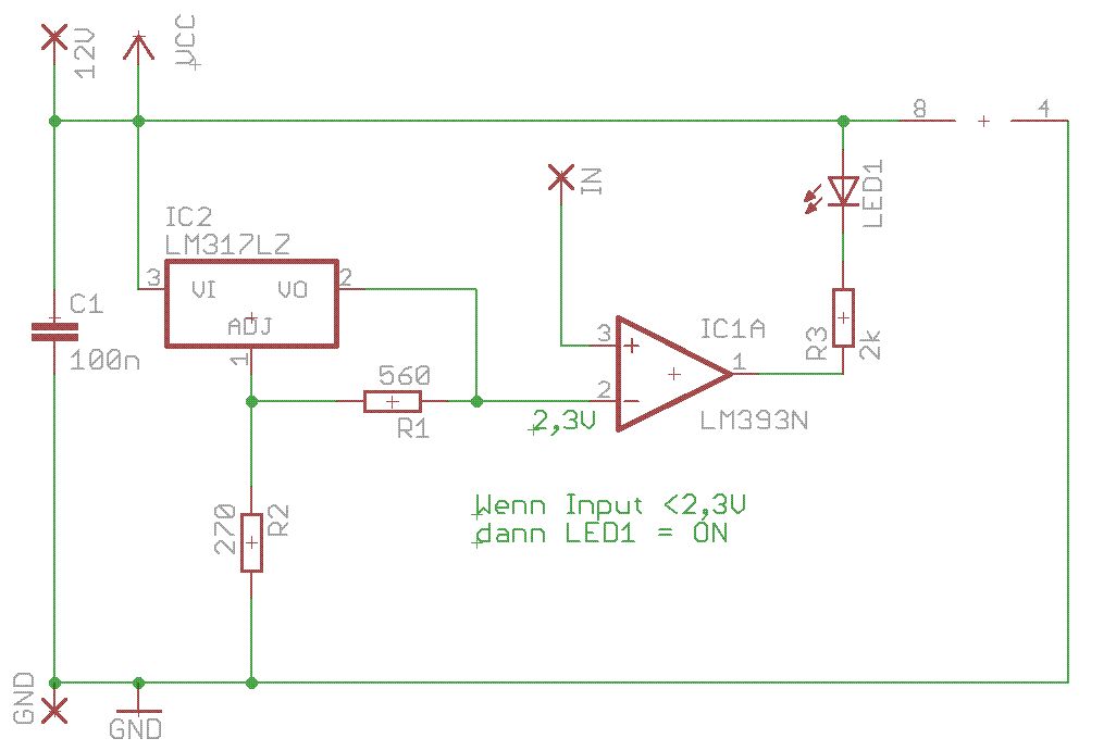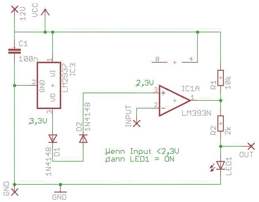 Das ist ein Oprn Drain Ausgang. Die LED muss also mit Vorwiderstand gegen +U, gegen Masse am Ausgang garnichts außer mann will das mit dem Ausgang überbrücken. Ist die verfügbare Referenzspannung nicht anders einstellbar nimmt man dafür einen Spannungsteiler. Diese Schaltung mit den Dioden ist so völlig sinnlos. Die restlichen Probleme wurden ja schon angesprochen. Ich würde aber eine Hysterese einbauen damit die Anzeige beim Schaltpunkt nicht flackert. Und... Datenblätter lesen! Dort sind auch Beispielschaltungen drin!