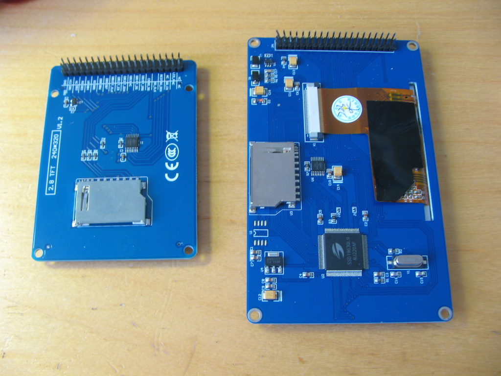 Salut, danke für die schnelle Rückmeldung. Ich nehme auch an, dass da kein SSD1963-Controller drauf ist und dass der Anbieter gar nicht genau weiß, was er da offeriert, denn er hat auch noch eine Platine mit 3,2" im Angebot, die nach seinen Fotos genauso leer ausschaut wie meine, aber dort steht in der Spezifikation explizit "SSD1963 or SSD1289 touch panel controller". Anbei die Fotos von der kleinen und der großen Variante. Ich schau jetzt mal, dass ich das ganze rückabwickle, weil sich meine Routinen doch sehr auf den Bildspeicher des SSD1963 verlassen. Grüße, JL7/Frank