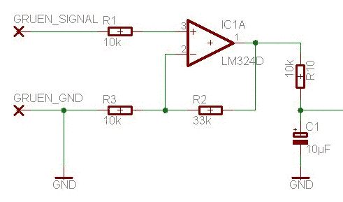 Hi, ich habe folgende Idee für ein simples AmbiLight. Wenn ich jede Signalleitung des RGB Signals mit einem OP abgreife und auf ca. 5V verstärkt an einen Kondensator lege (siehe Bild für Grün Signal, OP Betriebsspannung: +5V/0V), dann müsste ich doch über diesem eine sich langsam ändernde Spannung erhalten (wenn die RC-Komponente entsprechend abgestimmt ist). Enthält das Bild einen hohen Grünanteil (V_RGB,grün überwiegend ca 0,7V) , würde sich der Kondensator auf ca 5V aufladen. Ist der Grünanteil gering (ca. 0V), würde sich der Kondensator wieder entladen. Die Kondensatorspanung müsste somit eine Art Mittelwert des Grünanteils über der Zeit darstellen. Wenn ich das mit allen drei Farben mache, müsste ich somit doch ein ungefähr dem Gesamtbild entsprechendes Spannungstripel erhalten, dass ich mittels ADC einlesen und via AVR/LED-Treiber an RGB-LEDs ausgeben kann. Der Farbverlauf müsste dann ja automatisch weich sein, da sich die Kondensatoren "langsam" laden/entladen wodurch es zu keinen Farbsprüngen kommen kann (Spart mir evtl etwas an Software). Ich will nicht dass die Hintergrundbeleuchtung flackert (jeden Farbwechsel sofort durchführt), sondern sich lediglich innerhalb von 1 bis 2 Sekunden dem vorherrschenden Farbton anpasst. Also z.B. bei einer Unterwasserszene soll die Beleuchtung in einen Blauton übergehen. Bei Feuer rötlich werden. U.s.w... Die Beleuchtung soll auch nicht individuell für jede Bildschrimseite sein - das gefällt mir einfach nicht :-) Mir genügt eine einzelne Lichtquelle hinter'm Fernseher. Ich konnte es bisher leider noch nicht ausprobieren, aber ich wollte mal fragen, ob es etwas gibt, was da entgegenspricht. Ich sehe ein Problem im Syncronimpuls (-0,3V). Wenn der auf der Grünleitung liegt und kein Grünanteil vorhanden ist, habe ich nicht nur ständig -0,3V am OP-Eingang, auch der Kondensator bzw. ADC sind davon betroffen (wenn der Impuls bis dahin durchgeht). Im Datenblatt des OPs steht, dass er -0,3V am Eingang abkann. Aber das sind schon die "Absolute Maximum Ratings". Wenn ich einen LM324 verwende und wie im Bild nur mit +5V und 0V versorge, sollte am Ausgang keine negative Spannung auftreten (ADC/Kondensator sind sicher). Meine Fragen sind jetzt: a) Hält der LM324 das wirklich (auch auf Dauer) aus? b) Kommt wirklich keine negative Spannung an den OP-Ausgang? Wäre sehr nett, wenn mir da jemand was zu sagen kann, der es vielleicht schonmal probiert hat.