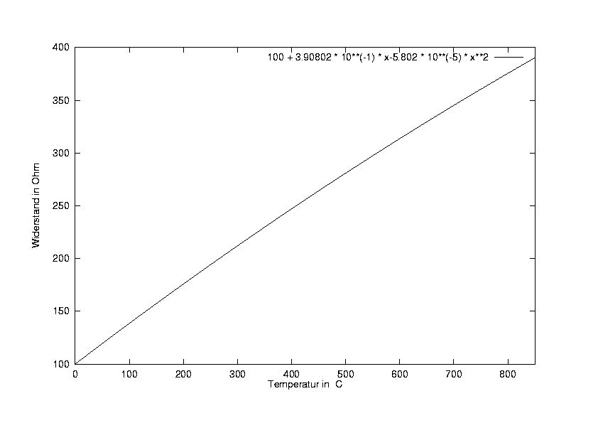 Hallo Ich möchte gerne mit einem Atmega8 und einem Pt100 die Temperatur messen. Mir reicht eine es wenn es in 1°C Schritten anzeigt. Ich bin jetzt so weit gekommen das ich die Spannung von der Brückenschaltung bekomme und auslesen kann. Aber jetzt weiß ich nicht wie von der Spannung auf meine Temperatur komme. Mfg Marcel