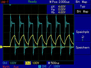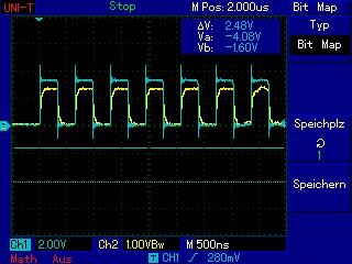Anfänger schrieb: > Ulrich H. schrieb: >> (1:1 Tastkopf ? > > jo, ist ein 1/1-Tastkopf, hab ihn auch grad mal umgeschaltet auf 1/10, > jetzt sehen die Signale "schöner" aus, danke für den Tipp. Ulrich H hat dir ja schon die Lösung präsentiert. Besser wird dein Signal nicht mehr. Allenfalls die C-Last die ohne Tastkopf fehlt macht die Flanke noch etwas steiler. Wenn du die SPI Taktrate nicht hochjagst müsste es so funktionieren. Eventuell noch die Leitung zum Spannungsteiler minimieren.
