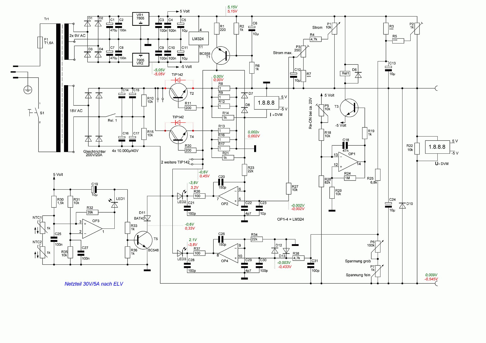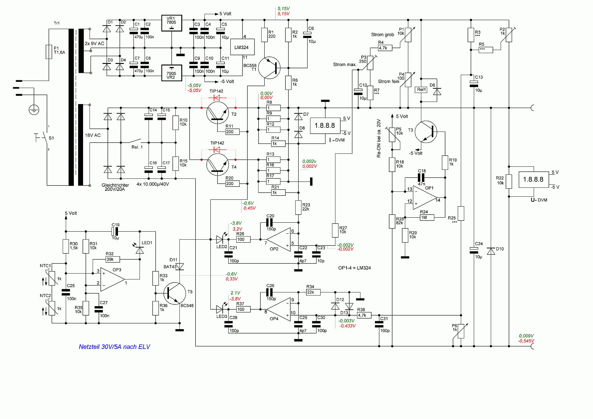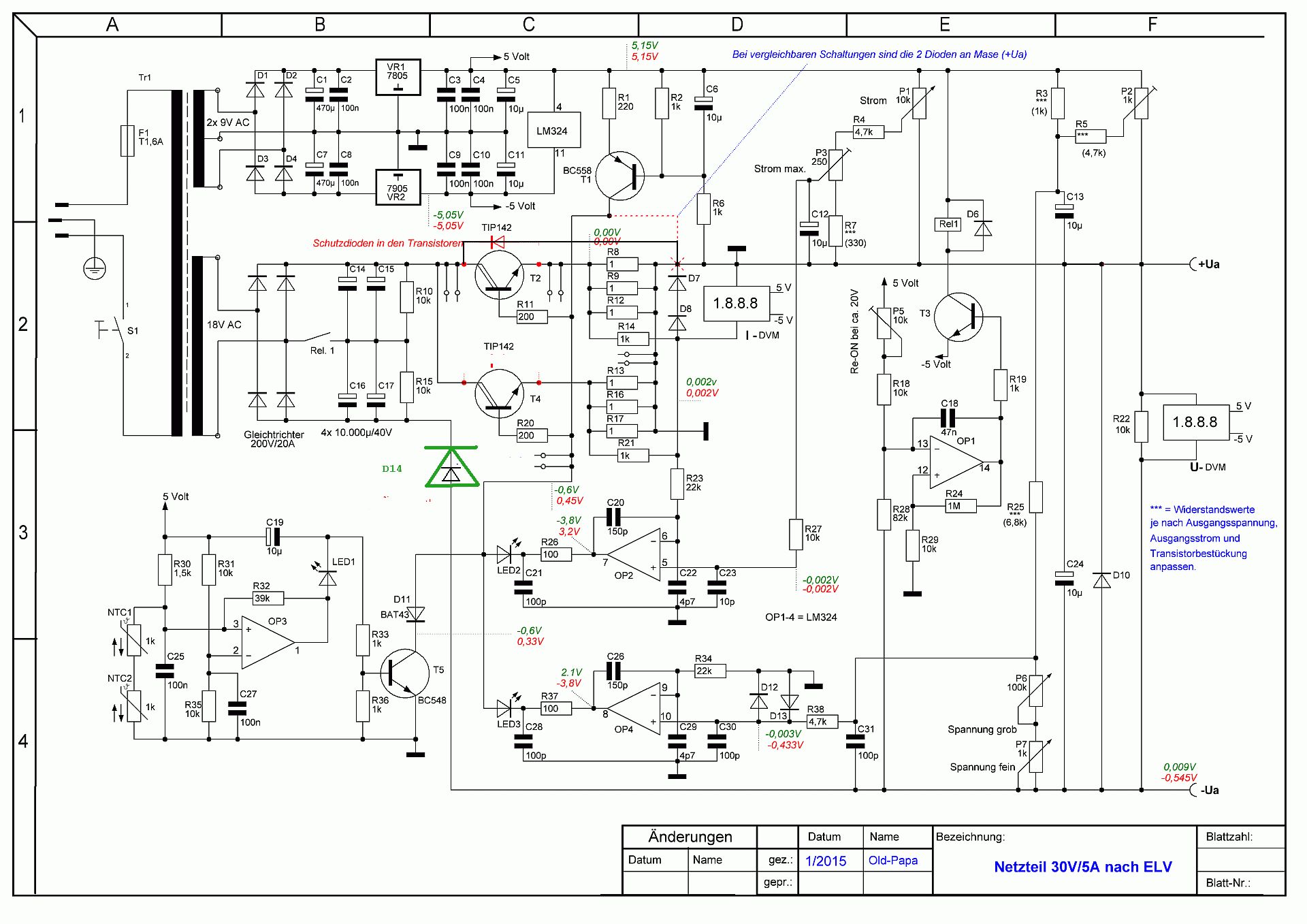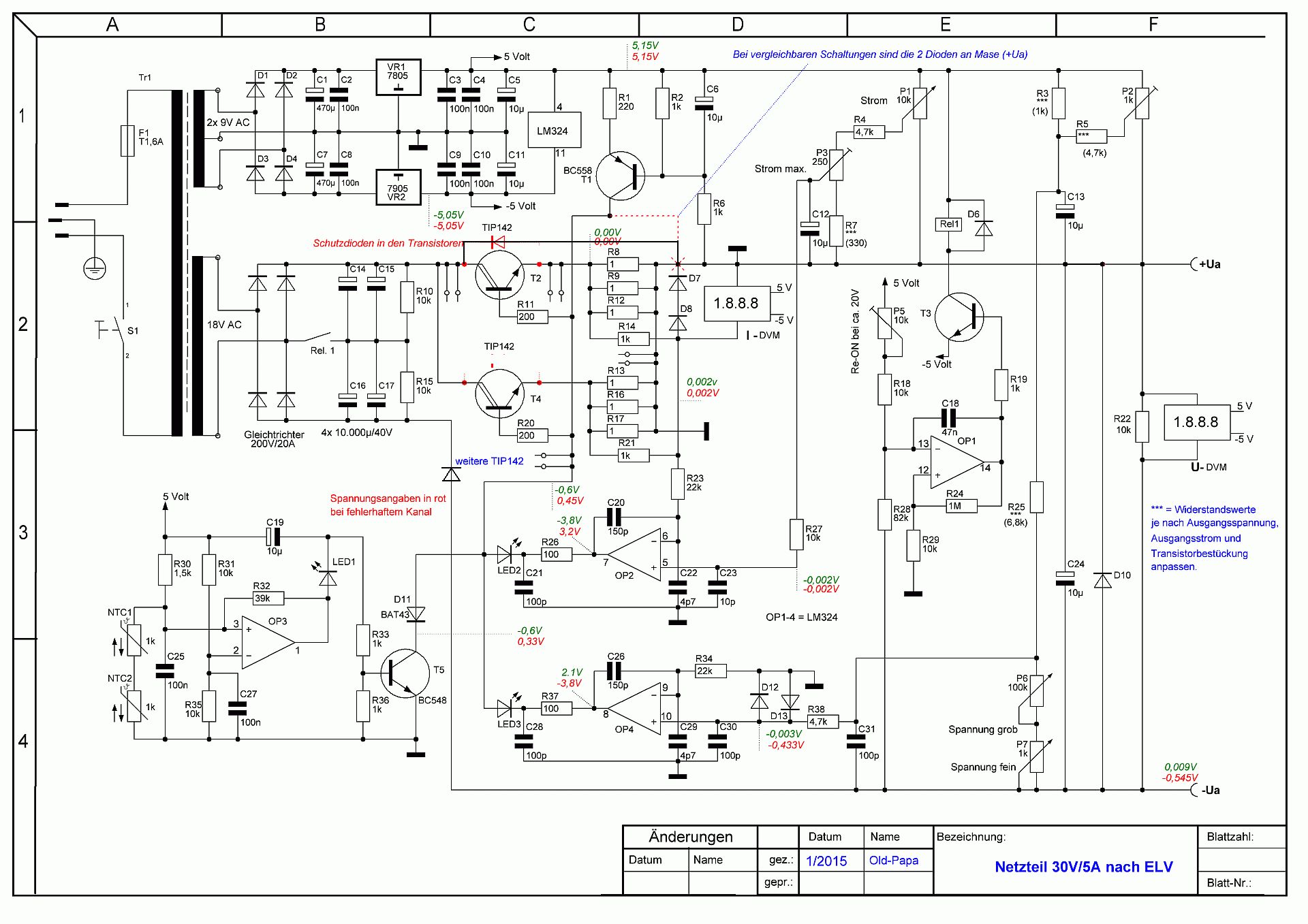 So, heute habe ich die Krücke mal stehen gelassen und stattdessen den Plan gezeichnet. Sowas hält dann doch länger auf, als geplant ;-) Ich habe in grün die Spannungswerte des intakten Kanals und in rot halt die vom defekten eingetragen. Gemessen gegen die Plusbuchse mit gutem Tischmultimeter (Kontron). Ich hoffe mich nicht vertan zu haben, hab ja gestern Nacht per Hand alles eingetragen (da war ich noch konsterniert ;-))) Alle Werte bei eingelöteter Schutzdiode (D16, neu D10). Die beiden Dioden (D9/10 alt, neu D7/8) habe ich nach Masse gezeichnet. Ich muss aber noch nachsehen, ob das auch wirklich so ist. Wie schon geschrieben, zum T1 erscheinen die mir nicht sinnvoll. Im gezeichneten Plan sind die BE-Nummern leider auf der Strecke geblieben, alles händisch nummerieren wollte ich dann doch nicht. Die fehlenden R-Werte an den Einstellreglern muss ich erst ausmessen. Über die Tip142 habe ich die eingebauten Dioden angedeutet, hilft beim Schaltungsverstehen ,-) Old-Papa