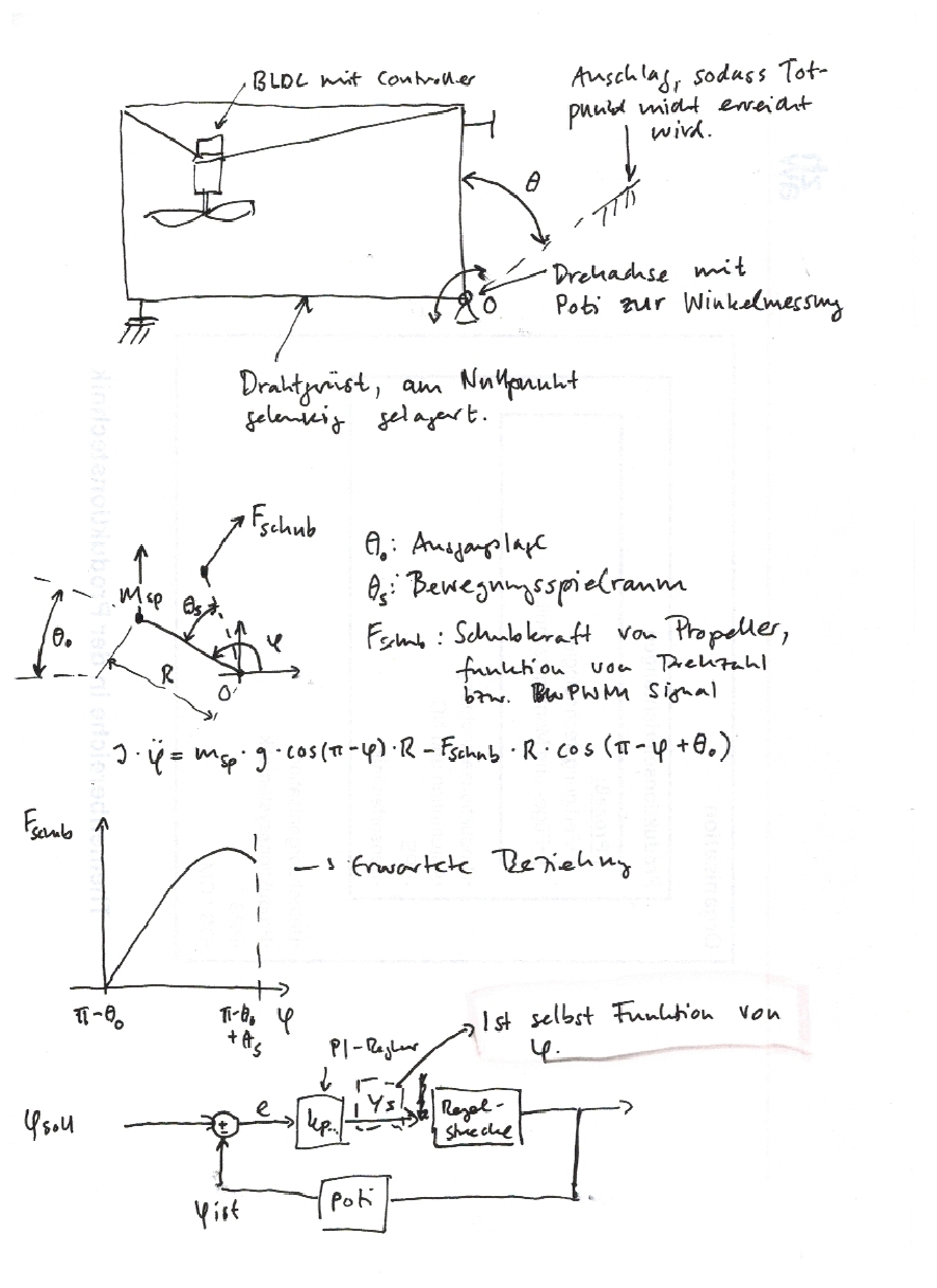 Hallo Leute Mit einem ATmega8 möchte ich den Winkel eines Hebelarmes der durch einen Propeller angehoben wird regeln (siehe Skizze). Was mir etwas Kopfzerbrechen bereitet ist, dass für jeden konstant gehaltenen Hebelwinkel eine andere Kraft notwendig ist. Ich kann mir gut vorstellen, dass der Regler bei diesem System nicht schnell genug reagieren kann. Nun zu meiner (vielleicht etwas komischen) Frage. Wäre es sinnvoll das Stellsignal nicht nur durch den PID-Regler, sondern auch durch eine Funktion des aktuellen Winkels zu beeinflussen? Gerne erwarte ich auch kritische Kommentare :) Vielen Dank für Antworten und Gruess, Samuel