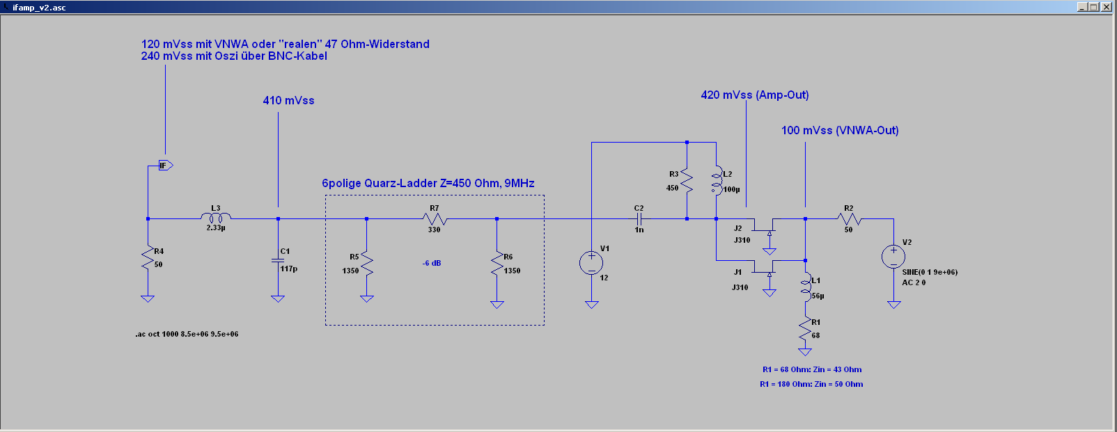 Hallo, zur Zeit baue ich einen RX mit einer 1. ZF von 45 MHz und einer 2. ZF mit 9 MHz. In der ersten ZF wird als PreAmp die gleiche bekannte Schaltung hinter dem Mischer ADE-1 verwendet wie in der 2. ZF. Das 1. ZF-Quarzfilter ist 8polig und besteht aus zwei Vectron M45B3 mit B=15 KHz und Z=800 Ohm und insertion loss ca. 6dB (gemessen)). Das Filter ist am Ausgang mit einem L-Tiefpass (700nH, ca. 16pF) auf 50 Ohm abgeschlossen. Laut VNWA beträgt die Verstärkung des 1.ZF PreAmp ca. 6dB. Also sind hinter dem Quarzfilter ohne dem Mischer ca. 0dB. Der VNWA war während der Messung direkt hinter dem L-Tiefpass angeschlossen. Soweit, so gut.... Die 2. ZF verwendet die gleiche Schaltung hinter dem Mischer (siehe Schaltplan). Im Gegensatz zur 1. ZF wird hier eine 6polige Quarzladder mit Z=450 Ohm, insertion loss 1.5dB und B=2.45 KHz verwendet. Die Quarzladder wurde einmal mit dem Matching-Tool des VNWA vermessen und einmal "normal" mit 2 L-Tiefpässen auf 50 Ohm. Alle Messungen zeigten keine Auffälligkeiten. Simuliert man die Schaltung im Anhang, so hat man direkt am L-Tiefpass eine Dämpfung von ca. 10 dB. An der Durchlasskurve des Quarzladders ändert sich dabei fast nichts. Da der Fehler nicht am Ladderfilter liegt, habe ich es in der Schaltung durch einen Draht ersetzt. ;) 1. ZF PreAmp 2x BF246B, Paar, Id=20mA 2. ZF PreAmp 2x J310, Paar, Id=20mA Nun ist die Frage warum diese Dämpfung auftritt und weshalb nur in der 2. ZF?