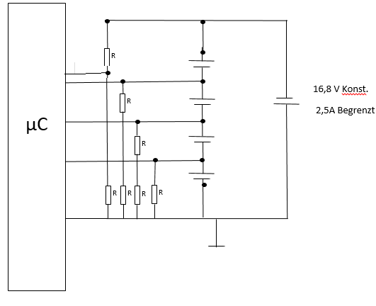 Hallo ich habe mal eine Frage, Ich will wie auf dem Bild zu sehen einen Spannungswerte während des ladens mit ADC's messen. Ich bin nur gerade an einem Punkt der mich ein bisschen Stutzig macht. Alle Akkus haben zusammen maximal 4 x 4,2 Volt = 16,8 Volt. Ich lade mit 16,8 Volt Konstantspannung mit 2,5A Strombegrenzung. Für Balancing ist gesorgt. (ich sehe gerade das die ADC 2 und 3 falsch angeschlossen sind, tun wir so als würden sie wirklich im spannungteiler abgegriffen :D) Fall: Alle Akkus haben 3,5 Volt und werden an die Quelle zum laden angeschlossen. Sprich alle Akkus zusammen haben 14 volt. wo bleiben die restlichen 2 volt? Der erste ADC misst dementsprehcen 16,8 Volt. Die anderen 10.5 , 7 und 3.5 Volt? Dem entsprechen wäre die Spannung an den Akkus z.B. Akku2 = ADC2-ADC3 usw. nur das würde ja bei Akku 1 nicht klappen weil ich nicht weiß wo die 2 volt sind? danke schonmal für eure Hilfe !
