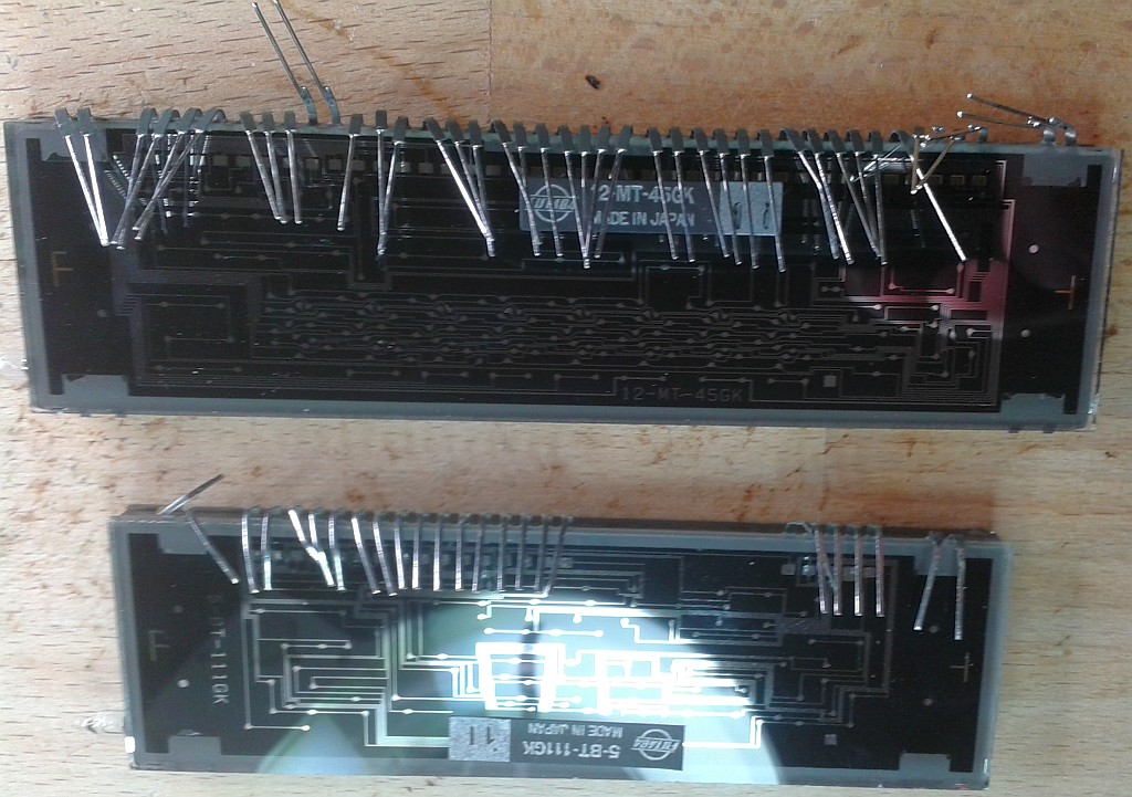 @Joerg: Das LC-Display unten rechts auf Deinen Fotos ist ähnlich dem hier: http://www.mikrocontroller.net/attachment/236816/LCD_Glas_alphanumerisch_08.jpg Es hat nur andere Symbole, aber auch 8 16-Segment-Stellen. VFD (FV651G) kann man einzeln für 0,45 €/Stk. bestellen.