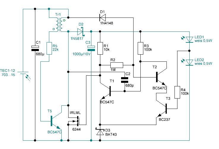 Hallo Foren Gemeinde, Ich bin die Tage über einen Beitrag auf YouTube gestolpert bei dem jemand mit 4 Peltierelementen und der eigenen Körperwärme eine LED zum leuchten bringt. Das Interessante daran war der Step-Up Wandler. Mir war nicht bewusst, dass man mit eine fast beliebigen 1:1 Übertrager, einen Widerstand, einem NPN-Transistor, einer Shottkey-Diode und einem Kondensator, einen Step-Up Wandler bauen kann, der ohne zusätzliche Versorgungsspannung schon bei etwas über 0,6V anläuft. Als Übertrager habe ich den 230V Eingangsfilterübertrager aus einem ausgedientem PC-Netzeil genommen, den hatte ich halt, es geht auch etwas kleineres :-). Ein Peltierelement hat als thermischer Generator einen linearen ohmschen Innenwiderstand. D.h. ich bekomm die meiste Leistung aus dem Peltierelement, wenn mein Verbraucher eben auch annähernd diesen Widerstand hat. Das hat diese Schaltung aber nicht. Die Spannung bricht am Peltierelement kaum ein, wenn man die Schaltung anschließt. Die Urschaltung ist im GIF grün dargestellt. Also habe ich das ganze mal gepimmt. T1,T2,R1,R2,R3 bilden ein Flip-Flop. T3,R4,LED1 sperren das Flip-Flop bis wenigstens etwas über 3V aufgebaut wurden. Erst dann ist die Spannung hoch genug um den MOSFET treiben zu können. D3 hebt den Schaltpunkt des Flip-Flops etwas an. Über D1 gelangt das Abschaltsignal an das Flip-Flop. Es schaltet ab, wenn die Eingangsspannung unter 0,3V gesunken ist. Hat der Tr1 sich dann über D2 in C3 entladen kann T5 sich wieder öffnen. Die Spannung über T5 fällt. Über C2 gelangt ein Puls auf das Flip-Flop was nun auch wieder den MOSFET einschaltet. Der MOSFET bleibt nun eingeschaltet bis die Eingangsspannung wieder unter 0,3V sinkt. Jetzt bricht auch die Spannung am Peltierelement ein und die LED's leuchten deutlich heller. Beim TEC1-12704 bin ich auf 0,7V und 150mA gekommen. Die Schaltfrequenz des Wandlers ist maßgeblich vom Tr1 abhängig, mehr als 10kHz sollten es aber nicht werden. Das Bild PT3.jpg wurde nur mit der Beleuchtung der angeschlossenen LED gemacht. LG Christof