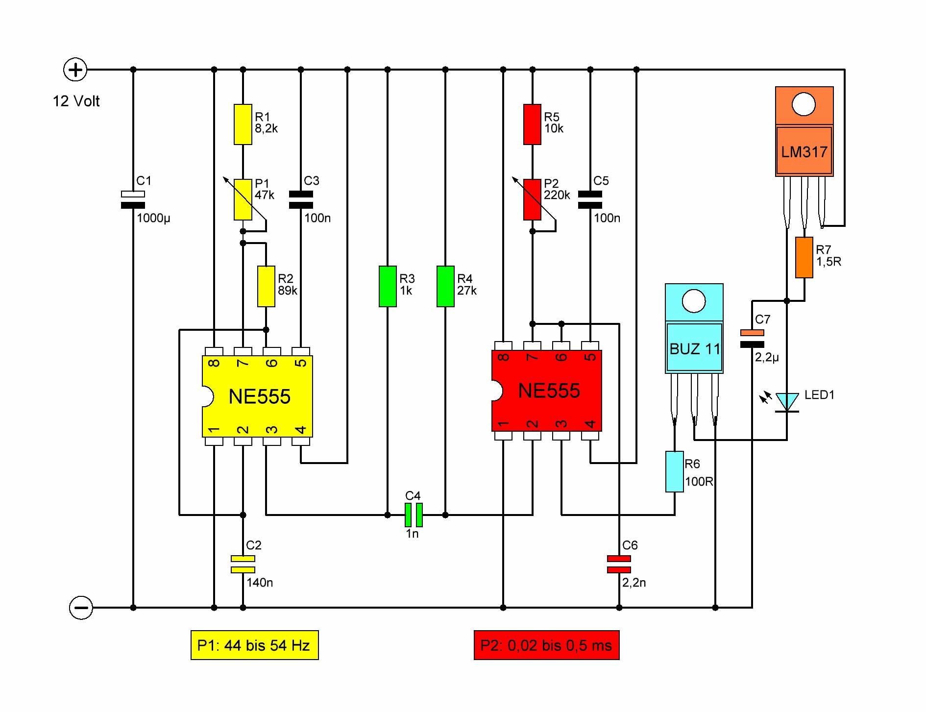 C2 grillt deine LED, weglassen. Der LM317 regelt nicht so schnell dass 0.02ms auch 0.02ms bleiben. Schlauer ist diese Schaltung: LED +12V --+----------|>|------------+ | +----+ | +--|7805|--+--+5V x--+--|< BD135 | +----+ | | |E 1000uF | 100nF 1k 5R3 | | | | | GND ---+-----+----+----------+---+ und als NE555 2 mal +5V --+-----+---+ | | | 180k | | | | | 47kPot | | | +-----+ +--200R--+----| | 1N4148 | +-|NE555|--|>|--x +-2kPoti-+--+-| | | +-----+ 100nF | | | | 100nF | | | GND --+-----+---+ Ja, man braucht für die alte Funktion nur 1 NE555. Ja, beide NE555 gehen an das x in der Schaltung oben.
