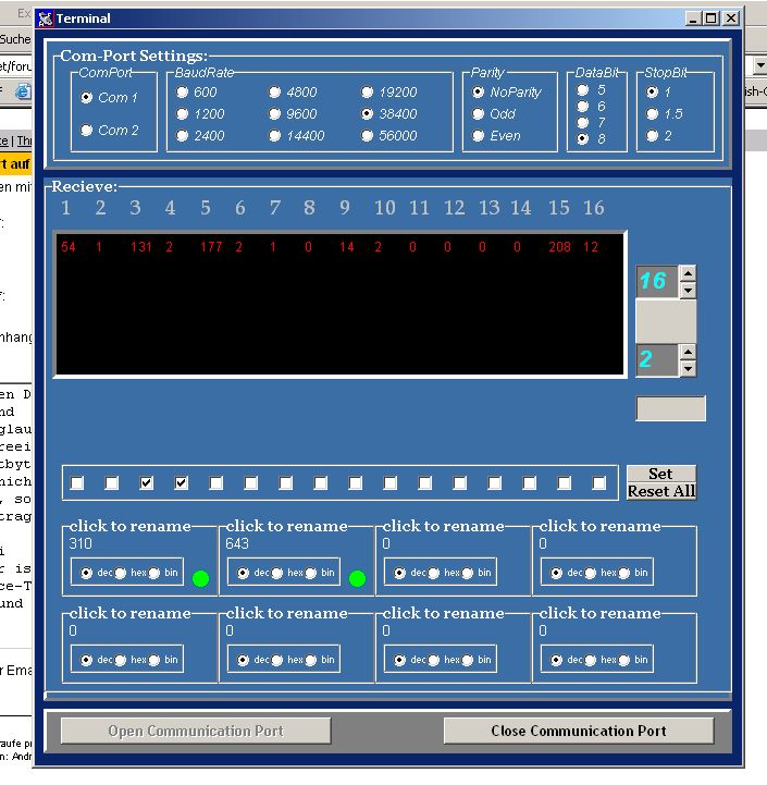 Hallo, 1.)kann mir bitte jemand erklären was Parity, 9Bit, und die stop bits bedeuten, und wann sie eingesetzt werden? 2.)In meinen Terminalprogrammen kann ich nirgends 9bit einstellen. Ich würde gerne 16Byts hintereinander vom Atmega8 empfangen, wobei der erste Byte aus synchronisationsgründen den 9.bit als 1 liefern sollte. Oder macht man das irgendwie anders? Danke Zoltan