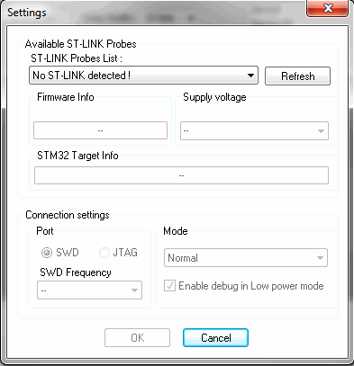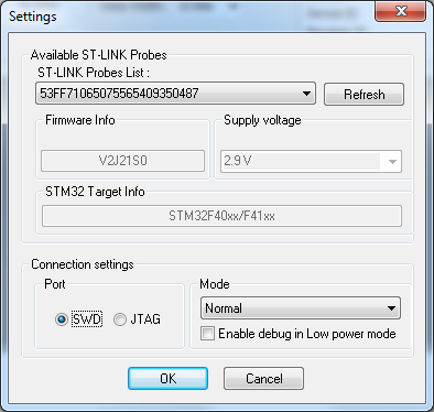 Okay, das mit den Jumpern ist schon so in Ordnung. Ich hab gerade mal den ST-Link aufgerufen, habe aber kein Board zum Anstecken hier. Allerdings sehe ich unter Target/Settings die Einstellung "Connection Settings" und dort kann man die "SWD Frequency" einstellen. Ich kann dir jetzt nicht sagen, was da stehen sollte, weil ich kein Board angesteckt habe. Aber du kannst ja mal versuchen, dort die Frequenz zu verringern. Sollte kein Problem sein, dann dauert nur das Programmieren entsprechend länger, aber das könnte die Ursache bei dir sein. Versuchs mal.