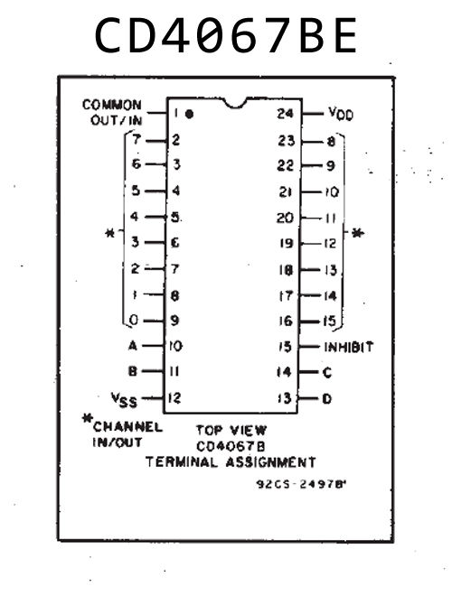 P.S.: Habe oben MUX und DEMUX vertauscht. Wenn du an den 16 Ports eine positive Spannung haben willst, musst du Common auf Vdd legen. INH muss immer auf Vss liegen, sonst ist das ganze Ding abgeschaltet. Auswahl der Ausgänge dann über A,B,C,D z.B. DCBA Port 0000 0 0001 1 0010 2 ... 1110 14 1111 15