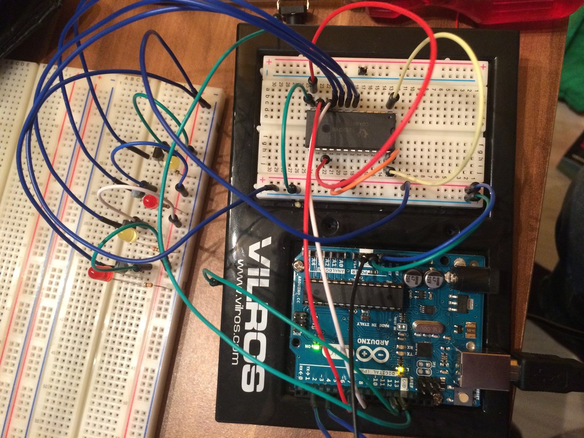 Hab jetzt alle anderen Ports auf Vss gesetzt. Es passiert trotzdem nichts. Hier die Schaltung bevor ich alles andere auf 0 gesetzt habe zur besseren Übersicht.