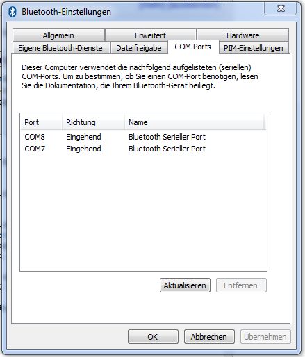 Sehr geehrtes Forum, ich habe folgenden USB BT Stick: http://www.amazon.de/gp/product/B0096Y2HFW?psc=1&redirect=true&ref_=oh_aui_detailpage_o01_s00 Diesen habe ich, nach Installation aller nötigen Treiber, an einen PC mit Windows 7 angeschlossen. Um zunächst die Bluetooth Funktionalität des USB BT Sticks auszuprobieren, habe ich mit meinem Handy und der App https://play.google.com/store/apps/details?id=Qwerty.BluetoothTerminal eine Verbindung zum PC aufgebaut. Am PC habe ich hTerm gestartet, und wenn ich von meinem Smartphone aus etwas sende, wird dieser korrekt am PC in hterm dargestellt. Wenn ich nun in Hterm etwas sende, empfängt mein Handy rein gar nichts in der Console. Meine Frage nun hierzu: Ich habe in den Bluetooth einstellungen bei den Com ports folgende Daten gefunden (siehe Anhang). Wenn ich mit Hterm versuche mich mit ComPort 8 zu verbinden, klappt zumindest das empfangen, eine Verbindung mit ComPort 7 ist gar nicht erst möglich. Auf dem beigefügten bild steht des Weiteren, dass beide Ports ausgehend sind, d.h. ja eigentlich, dass mein PC gar nichts ans Handy senden kann (es müsste ja ausgehend oder bidirektional sein). Was kann ich tun, damit ich nun sowohl DAten senden, als auch empfangen kann, und zwar auf beiden Seiten (PC und Smartphone). Das ganze mache ich aus Testzwecken, später, wenn alles glatt läuft, würde ich einen MC mit BT Modul mit dem PC verbinden, bzw. mit dem Smartphone. Danke für eure Hilfe, Tipps und Vorschläge, m.f.G.: Developer_X