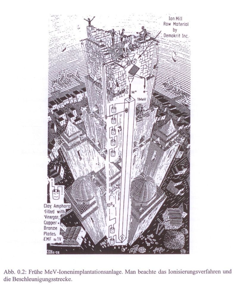 Ich zitiere mal einen Universitäts-Professor, der 2010 in Ruhestand gegangen ist. Seine Ausführungen stammen scheinbar aus den 1980er Jahren, wurden im Studienjahr 2003/2004 überarbeitet und mit folgenden Wortlaut/Bildern noch im Studienjahr 2010/2011 verwendet: "Es wird allgemein anerkannt, daß der wesentliche Anstoß zur Entwicklung von Halbleiterbauelementen nach 1945 in den Bell Laboratories erfolgte. Es ist Zeit, diesem Irrtum einmal energisch entgegenzutreten. So verweisen wir zum ersten auf einen deutschen Beitrag. Der Naturforscher und -schilderer Agricola diskutierte schon 1557 in seinem Technologie-Handbuch "De re metallica" den Vor- und Nachteil der Ionenimplementation (Abb. 01., links, ref. 1) gegenüber der Diffussion (Abb. 0.1, rechts). Weiterhin ist weitgehend unbekannt, dass schon die alten Sumerer im Besitz einer Hochenergie-Ionenimplantations-Maschine waren. Genaue bautechnische Daten sind nicht überliefert, es existiert jedoch eine mittelalterliche Kopie (Abb. 0.2, ref. 2). Die Beschleunigungsstrecke wurde aus hintereinandergeschalteten Batterien gewonnen. Jede Batterie bestand aus einem Gefäß gebrannten Tons, das mit Essigsäure gefüllt war. Die Elektroden wurden aus Zinn und Kupfer hergestellt. Die Batterien wurden in Serie geschaltet und aufeinander gestapelt. Für eine 100MeV-Beschleunigerspannung ergaben sich dabei beträchtliche Turmhöhen." Als ref. 1 benennt der Autor: Dearnley, G., Freeman, J. H., Nelson, R. S., Stephen, J.: "Ion Implantation", North-Holand Publ. Co., Amsterdam (1973) Als ref. 2 benennt der Autor: Escher, M. C.: "Turm von Babel" (1928), verändert von $AUTOR (1987) Abb. 0.2 habe ich euch eingescannt. Als Gedankenanstoß zur "mittelalterliche Kopie": http://en.wikipedia.org/wiki/Tower_of_Babel_%28M._C._Escher%29 Ansonsten ist der Autor jahrzehntelang im Bereich Halbleitertechnik/Solarzellenforschung aktiv gewesen und war die ganze Zeit Lehrstuhlinhaber mit Reinraum & Co.. Die Unterlagen zur Halbleitertechnik, aus denen das Zitat stammt, sind ansonsten makellos (bis auf Rechtschreibfehler). Warum schreibt man als Professor denn sowas und fälscht ein Bild auf primitivste Art und Weise (1928=Mittelalter)?