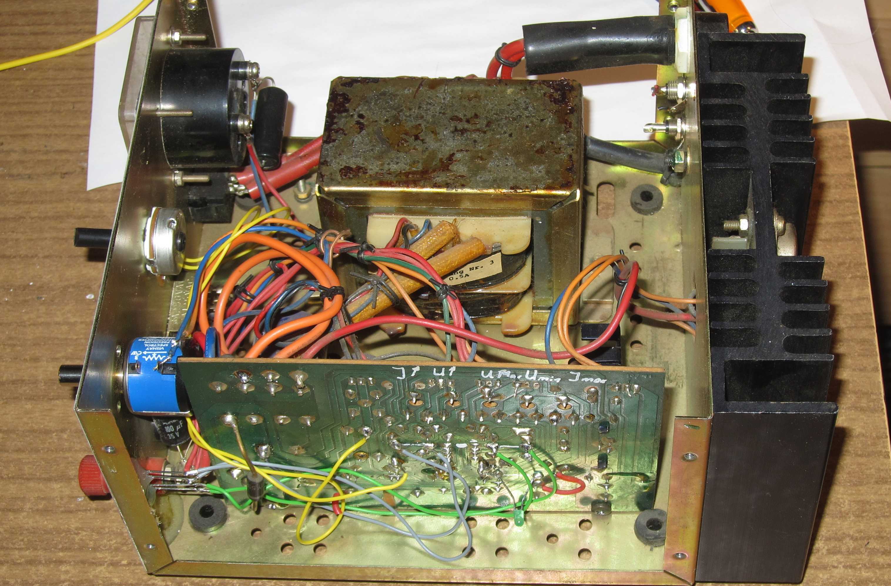 Ein paar Bilder von diesem Labornetzteil. Ein Doppel-OPV befindet sich auf der Platine und auf dem Kühlkörper 2 x 2N3055, die parallel geschaltet sind. Bernhard