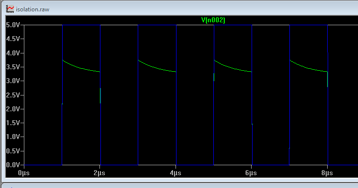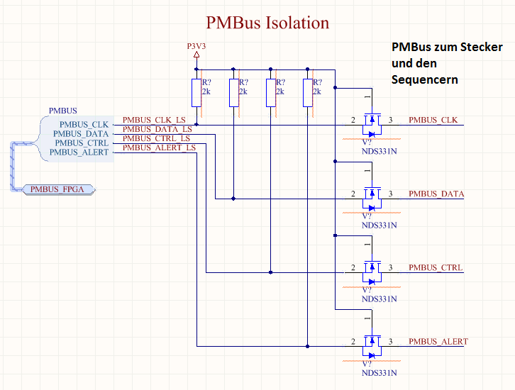 Hallo, ich habe auf einem Eval Board von Xilinx (das AC701) eine PMBus Isolator entdeckt, dessen Funktion mir nicht ganz ersichtlich ist. Vielleicht kann mir jemand helfen oder einen Tip geben wozu die Beschaltung gut ist. In der angehängten Grafik ist der Ausschnitt des Schaltplans zu sehen. Die linke Seite ist mit dem FPGA verbunden, dessen IOs an dieser Stelle mit 3,3V versorgt werden. Die rechte Seite der Schaltung ist mit einem Stecker verbunden, durch den man mit einem USB-Adapter auf den Bus zugreifen kann. Außerdem sind neben dem Stecker noch zwei Sequencer (UCD90120) auf dieser Seite des "Isolators" angebunden. Die rechte Seite wird ebenfalls mit 3,3V betrieben. Ich frage mich jetzt wozu dieser Isolator dient. Eine Möglichkeit wäre den Bus vor möglicher Überspannung (durch den USB-Adapter) schützen zu wollen. Könnte passieren, wenn jemand einen USB-Adapter mit 5V anschließt. Dann wären aber die Sequencer auch hinüber, weil die ja auch vor dem Isolator sind. Zudem hat der Isolator ja nur eine begrenzte Wirkung bei Überspannung. Ich hab das mal simuliert (siehe Anhang, blau: Spannung rechte Seite (5V), gelb: Spannung linke Seite). Ich würde behaupten der FPGA wäre durch die Überspannung bei den steigenden Flanken hinüber..? Wozu also diese Beschaltung?