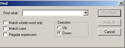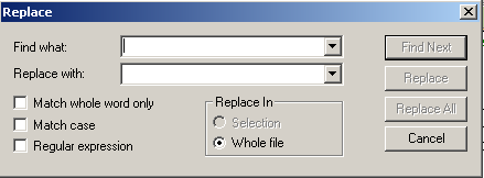 Hallo, ich hoffe jetzt wirds für mich nicht zu peinlich, aber diesen Dialog gibt es bei mir nicht. Unter "Edit" gibt es bei mir die Dialoge "Find", "Replace" und "Find in files" Habe Bilder angehängt. Was für eine Version verwendest du? Grüße Max