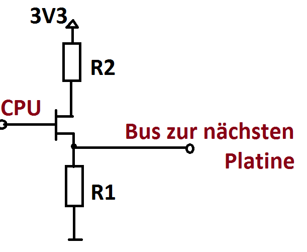 Hallo, ich möchte ein CS-Signal von meiner MCU über ein Kabel an eine andere Platine senden. Wenn meine MCU low sendet, soll auch low auf der anderen Platine ankommen. Das gleiche dann für high. Damit der Pin der MCU nicht direkt an der Schnittstelle anliegt, möchte ich einen Transistor dazwischen setzen (um Stromsparend zu sein, würde ich einen MOSFET wählen). Macht das Sinn, so wie ich es auf dem Bild gemacht habe? Welche Widerstände würdet ihr dafür wählen?