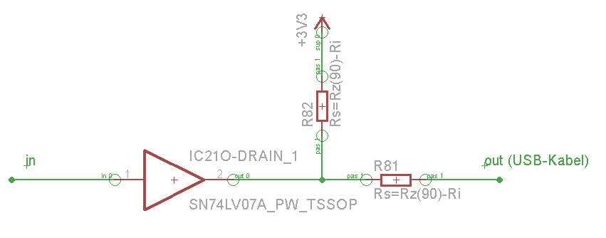 Hallo, ich verwende den IC SN74LV07A, einen nicht-invertierender Treiber, dessen Ausgang oben-drain ist. Er soll über ein USB-Kabel mit einer anderen Platine kommunizieren. Um das Problem mit dem Wellenwiderstand zu lösen, möchte ich eine Serienterminierung vornehmen. Dazu muss Rs = Rz minus den Innenwiderstand der Quelle sein. Ich weiß nicht ob ich nun blind bin, aber ich finde ihn nicht im Datenblatt. http://www.ti.com/lit/ds/symlink/sn74lv07a.pdf Oder kann ich ihn aus einen der vielen Spannungs- und Stromangaben errechnen?