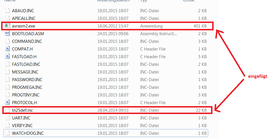 Hallo, ich habe ein Verständnisproblem bei dem AVR Bootloader FastBoot von Peter Dannegger. Und zwar steht bei "Assemblieren des Bootloaders (Ursprüngliche Version von Peter Dannegger)" -> Danach wird der Assembler aufgerufen (m8.asm für ATMega 8) und der Bootloader kompiliert: Ich habe soweit alle Dateien zusammen (siehe Bild im Anhang) und nun stellt sich mir die Frage! Wie bzw. Wo rufe ich den Assembler auf? In AtmelStudio oder gibt es sonst irgendein Programm? Ich habe mal versucht die Datei avrasm2.exe zu starten, aber diese wird innerhalb von wenigen ms zugemacht. Was mache ich falsch? Viele Grüsse Stefan