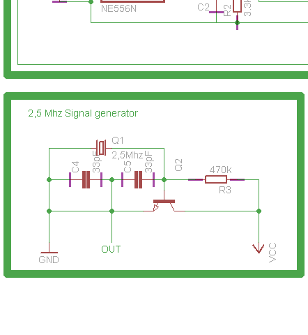 wenn du die Schaltung so aufbaust, wirst du am Ausgang (OUT) keine 2,5 MHz haben.(Schluss zwischen GND und OUT. Deka65
