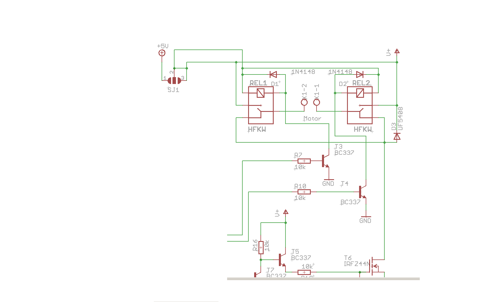 Hi, ich bräuchte diesmal wirklich recht DRINGEND Hilfe. Es geht um die Induktionsspannung von einem Gleichstrommotor. Es geht mir um D3 (siehen Anhang) Im Ruhezustand liegt der Motor mit beiden Klemmen an V+. Dann wird für Rechts/Linkslauf einer der beiden Relais angezogen und schaltet zum T6 durch, der wiederum bei Aktvierung zu GND weiterschaltet. Nun geht es mir um den Auslauf des recht wuchtigen Motors und seine Induktion. In jedem Fall schalte ich den T6 als letztes an und als erstes wieder aus, um Funkenflug in den Relais zu vermeiden. =============== Die Frage: Sollte ich nun unmittelbar nach dem T6 die Relais auch wieder beide in Ruhezustand bringen (Beide auf V+ = Kurzschluss = Bremse = evtl. Funkenflug beim Schalten)? Oder sollte ich die Relais in der letzten Stellung (wie der Motor auch bestromt wurde) stehen lassen und die Induzierte Leistung über D3 fließen lassen? Ist dies der Sinn von D3? Zu welchem Vorgang könnt ihr mir raten? Grüße Oekel