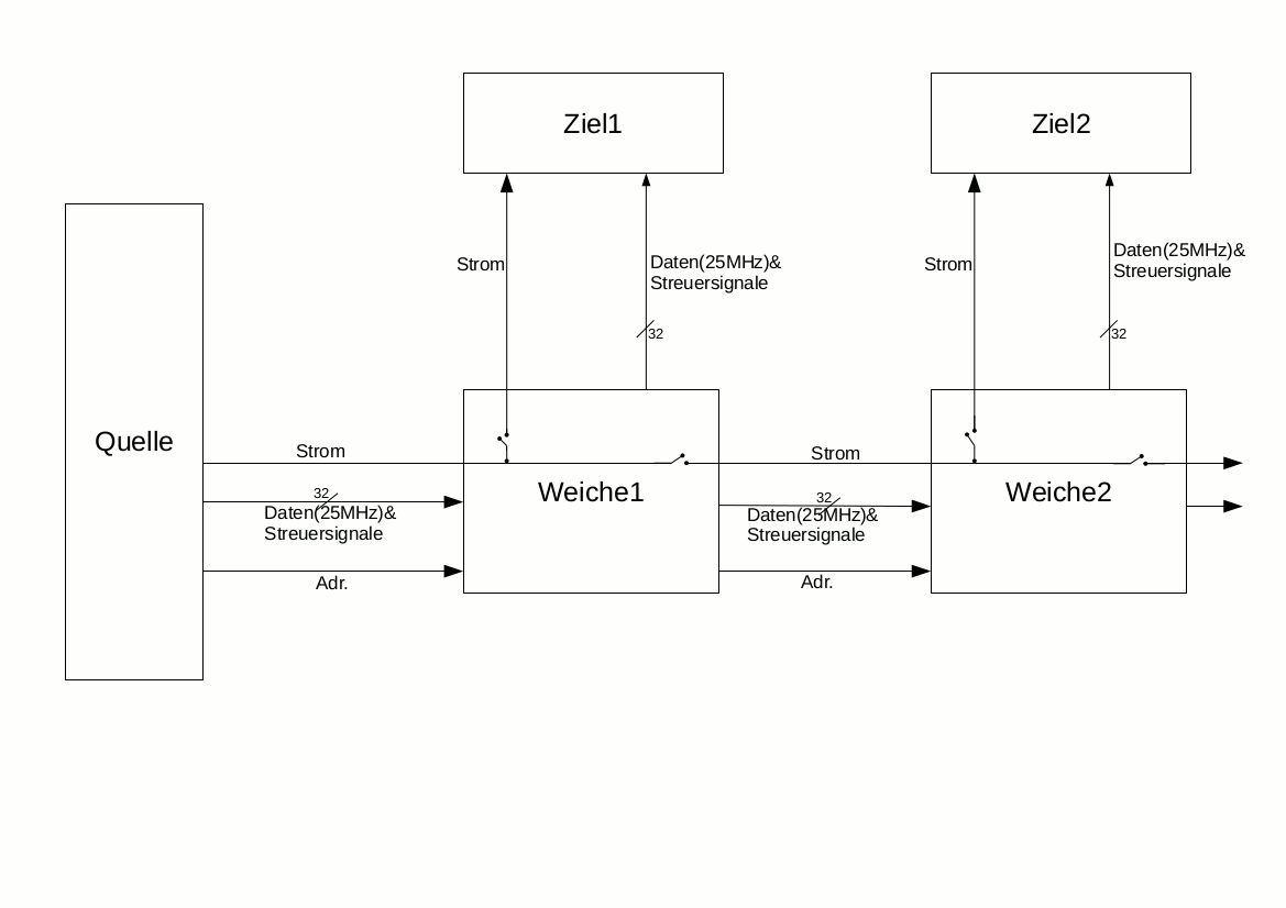 Ok, soweit so gut :-) Die Quelle ist also ein Rechner, der die Daten und Adressen erzeugt, richtig? Das "Ziel" ist wiederum ein Rechner, der die Daten abtastet? Oder ist der Datenbus synchron? Also erzeugt die Quelle einen Takt mit dem die Daten synchron geändert werden und den das Ziel auswertet, um die Daten zu übernehmen? So wie sich die Skizze für mich darstellt, ist dies nicht der Fall. Sprich: Du hast Adressen, Daten und Steuersignale, aber diese sind nicht synchron zu einem Takt, der mit übertragen wird. Richtig? Und die Kommunikation ist unidirektional? Also Daten werden nur von der Quelle an das Ziel übertragen aber nicht andersrum? Wenn diese Annahmen stimmen, dann verstehe ich nicht, warum du deine Daten über eine "Weiche" schalten willst. Denn sowas macht man, wie ich ja ganz am Anfang bereits erläutert habe, über einen ganz normalen Bus, an dem mehrere Teilnehmer hängen, die dann per CS ausgewählt werden. (vgl. Anhang)