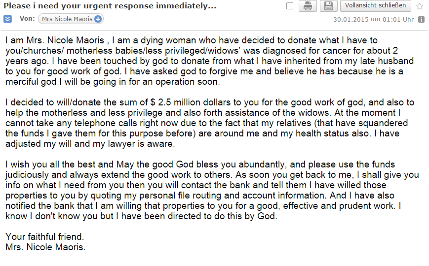 Ich bin durch einen glücklichen Zufall heute zum Millionär geworden und habe jetzt noch keine Idee, was ich damit anfangen soll. Um das Geld zu bekommen muss ich ihr nur meine Kontozugangsdaten und Pin schicken und im Gegenzug bekomme ich 2,5 millionen dollar. Ich kann mein Glück noch gar nicht fassen. Sprachlos...