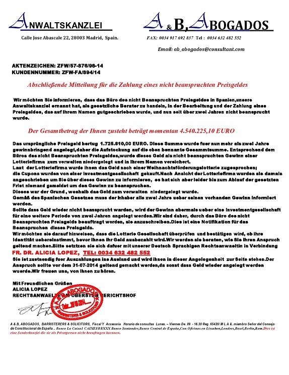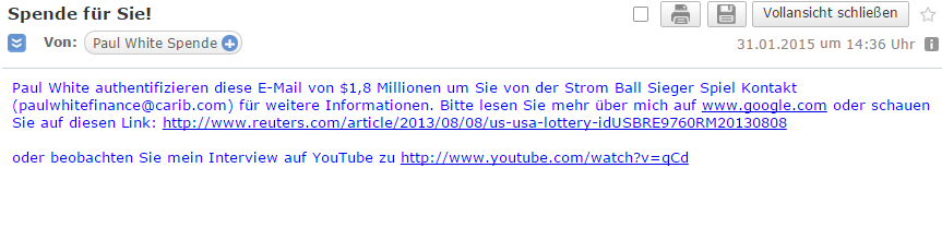 IncreasingVoltage .. schrieb: > Ich kann mein Glück noch gar nicht fassen. Sprachlos... Du hast aber auch ein Glück! Denk aber daran, nicht das ganze Geld zu verpulvern, denn es soll auch Witwen und Waisen zukommen. _____________________________________________________________________ Im Ernst: Ich sehe den Zweck des Briefes nicht, denn Du wirst ja nicht aufgefordert, irgendwelche Beträge irgendwohin zu senden. Sehr konisch, äh komisch. MfG Paul