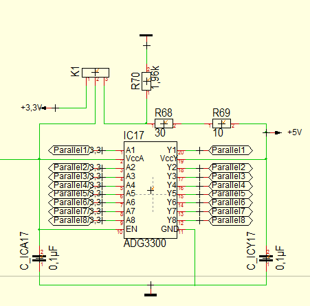 Hej Leute, ich hab hier ein Problem mit einem Pegelwandler und komm auch mit Tante Google keinen Schritt weiter. Ein ADG330 soll zwischen meinem AVR32UC3C... und einem SAMA5D3-Board den Spannungpegel von 5V auf 3,3V bzw. anders herum wandeln. Damit auch 5V-Boards zum Einsatz kommen können, gibts den Jumper K1 mit dem die Spannung umgeschaltet werden kann. Sobald ich jetzt das Board an meine Elektronik anschließe, fängt der Pegelwandler an zu schwingen, sodass ich mit dem Oszi bei ca. 2,5V nur noch rauschen messe. Das Signal schwankt nur noch ein wenig hin und her obwohl es zwischen 0V und 3,3V bzw. 5V wechseln sollte. Auch die Versorgungsspannung fängt dann an zu rauschen. Ich hab schon die Blockkondensatoren verändert, meine eigene Spannungsversorgung gegen ein Labornetzteil getauscht, zusätzliche Pullup- und Pulldown-Widerstände eingefügt. Bringt alles keine Verbesserung. Kennt jemand das Problem und hat eine Lösung oder Idee was ich noch machen kann?