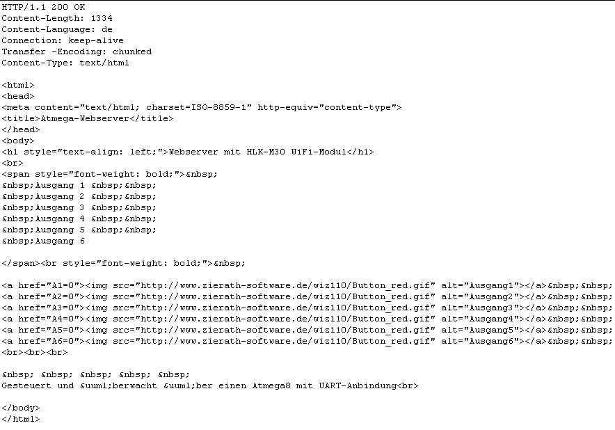 Hat schon jemand Erfahrung mit dem HLK-M30 machen können ? Ich möchte das Modul in Verbindung mit einem Atmega8 als Webserver nutzen. Solange ich nur Text als HTML als Request zurück sende ist alle gut. Sobald ich aber eine HTML mit Bildern als Antwort senden will, erscheint im Browser nur noch die Hälfte und die Bilder garnicht :-(