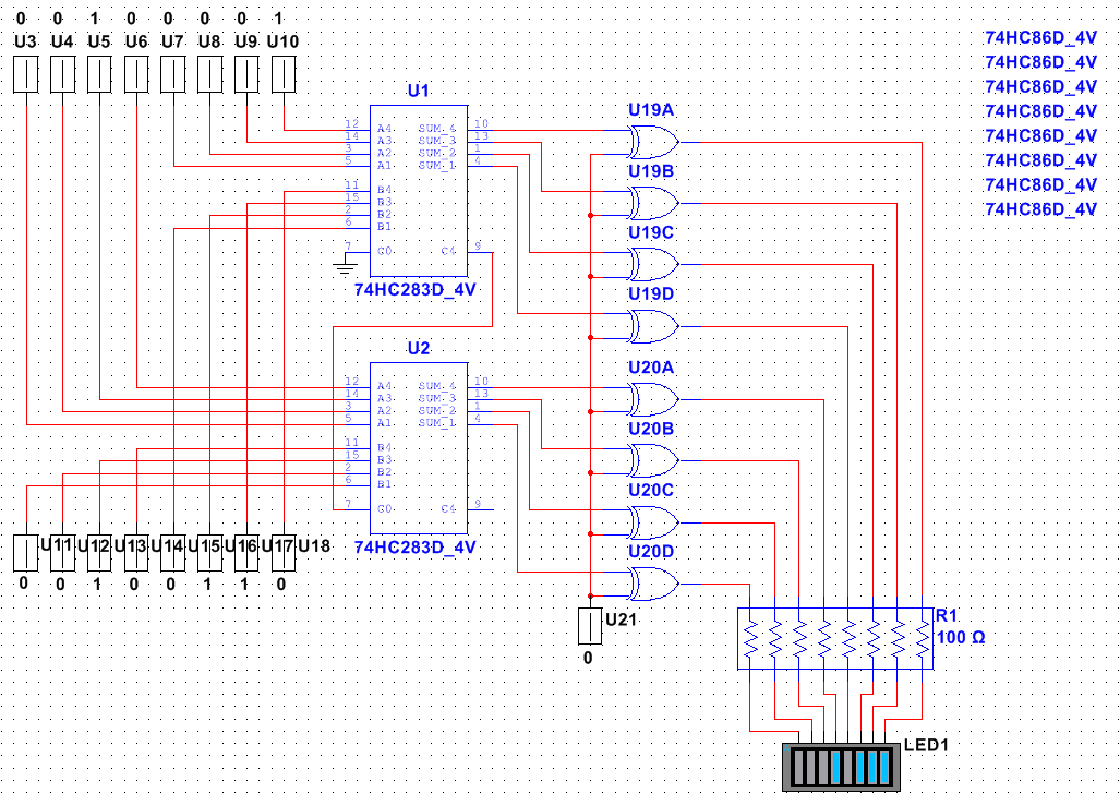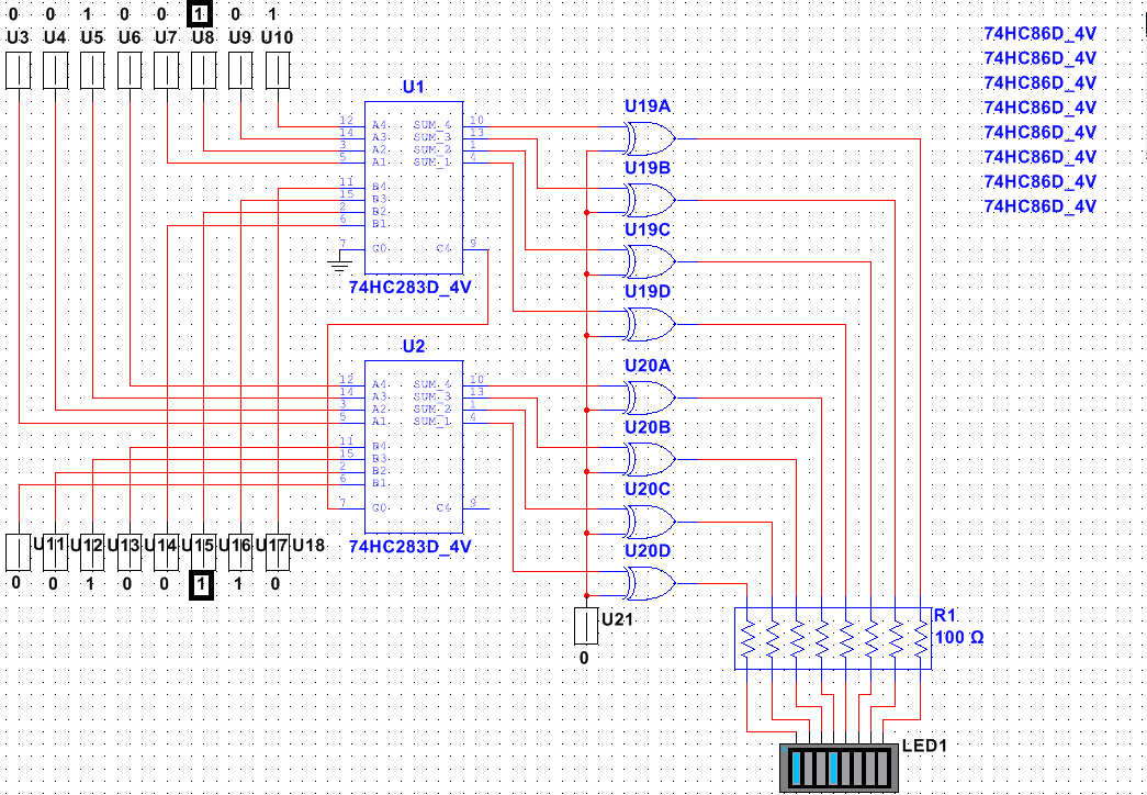 Du hast alles mögliche verdreht angeschlossen. Richtige Bitfolge oben wäre: U6 U5 U4 U3 U10 U9 U8 U7 unten: U14, U13, U12, U11, U18, U17, U16, U15 Ausgabe (von links nach rechts an LED1): U2 SUM_4 U2 SUM_3 U2 SUM_2 U2 SUM_1 U1 SUM_4 U1 SUM_3 U1 SUM_2 U1 SUM_1 Was du effektiv addierst ist 0x48 + 0x46 = 0x8e also 01001000 +01000110 --------- 10001110 Und genau das wird auch ausgegeben, nur eben in sehr eigenwilliger Bitfolge auf LED1.