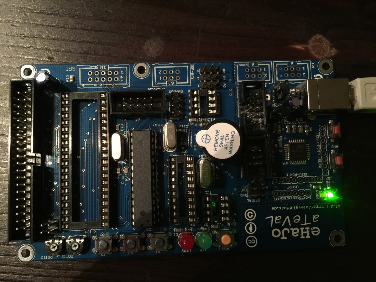 Hallo! Mich hat neulich irgendwie das Microcontroller Fieber gepackt und ich wollte direkt loslegen. Also habe ich im Keller gesucht und tatsächlich mein altes Pollin Atmel Evaluation Board gefunden. Nach gefühlten 12 Stunden habe ich dann allerdings aufgegeben per USB->Serial Adapter das Board an meinem RS232-Schnittstellen losen Ultrabook zum Laufen zu bringen. Ich habe dann irgendwo hier bei Microcontrollernet gelesen, dass es ein tolles Board von eHaJo gibt, dass kompatibel zu dem Pollin Board ist, aber gleich mit USB läuft. --> Also gleich bestellt. Mitterweile ist es auch zusammengelötet, ich habe mich beim Löten wieder wie ein Kind gefühlt oder wie im Elektronik-Fachkurs in der Schule. Nun gut, dass Board ist fertig gelötet und wird in Window erkannt. Leider habe ich es bis jetzt noch nicht zum Laufen bekommen mit Atmel Studio. Mein Ziel ist es erstmal den LED-Blinker Beispielcode zum Laufen zu bekommen: http://dokuwiki.ehajo.de/artikel:ateval:led-blinker Beim Suchen nach der Lösung bin auf diesen Thread gestoßen und habe mir erstmal die Doku weiter angeschaut. Beitrag "eHaJa Ev. Board ist unbrauchbar." Ich habe dann mit FLIP die Firmware vom Board auf Version 1.04 (BEIDE) aktualisiert. Ich kann das Board jetzt in den Modus MKII und Serial oder in den Modus avrdude versetzen. Da ich Atmel Studio nutzen möchte also 2x Blinken MKII Modus. Das geht, das Gerät wird richtig angezeigt und taucht auch in Atmel Studio auf. Der Build des LED-Blink-Beispiels lässt sich auch kompilieren und es purzelt eine .hex heraus. Jetzt muss ich dieses Image nur noch auf den Controller flashen... Im Device Programming Dialog kommt jedoch ein Fehler nach einer gewissen Zeit wenn ich auf Apply drücke: Timestamp: 2015-02-06 21:12:34.257 Severity: ERROR ComponentId: 20100 StatusCode: 1 ModuleName: TCF (TCF command: Tool:connect failed.) Could not establish communication with the tool. Das Board fängt dabei an 2 mal nacheinander zu blinken (rot), nach einer kurzen weile nochmal, und nochmal, danach erscheint die Fehlermeldung. ______________________ Auf dem Board habe ich bei dem mittleren Quarzen 8.000Mhz gesteckt und deshalb auch den Code auf 8Mhz geändert. - Ich hoffe das ist richtig. Mir fehlen leider die Elektrokenntnisse warum man welche Quarze benötigt. Die Programmiergeschwindigkeit ist mit 1,8MHz aber unter der 1/4 Geschwindigkeit. Bei 125kHz klappt es allerdings auch nicht. Ich bin echt ratlos was ich noch falsch mache, bzw. woran es liegt. Ich würde mich sehr freuen, wenn Ihr mir helfen könntet. Vielleicht sind die Jumper falsch?