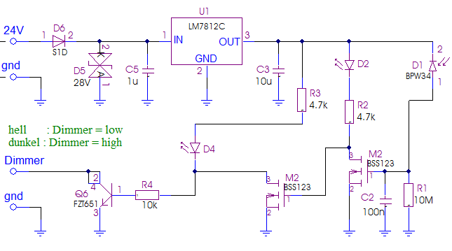 Hallo, die Frage ist, was du bezwecken willst? Da es zwischen subjektiver Helligkeit und Lichtleistung keinen linearen Zusammenhang gibt, sondern eine eher exponentielle Funktion zu erwarten ist, kannst du mit einer einfachen linearen Schaltung nur einen rel. begrenzten Bereich messen. Dazu würde sich eine Fotodiode in Transimpedanzschaltung gut eignen. siehe hier linker Teil: http://uwiatwerweisswas.schmusekaters.net/Uwi/ELEKTRONIK/Opto_Laser/Fotoverst%e4rker.PDF Diese Schaltung kannst du noch vereinfachen. - R4 und C5 weglassen. - R3 und dazu parelelles C ist auch nicht nötig ->überrbücken Für höhere Dynamik müßte der Messbereich umgeschaltet werden oder ein Verstärker mit exponetieller Kennlinie verwendet werden. Als einfachere Dimmerschaltung kannst du auch die im Anhang nachnutzen. Mit dem Widerstand R1 wird die Ansprechempfindlichkeit eingestellt. Mit einem analogen Eingang kannst du auch direkt an Drain von M2 gehen. Gruß Öletronika