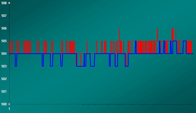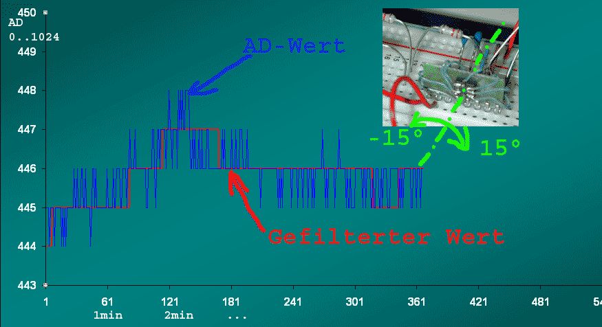 hi edi, das mit dem 999 war nur ein Beispiel. In Wirklichkeit sieht das ganze so aus (Anhang). Das Signal ist von einem ADXL202 Beschläunigungssensor, den ich zur Neigungsmessung benutzen will. Auf dem Bild bedeutet ein Sprung einen Winkel von 0.03°! Blau ist der unsaubere Eingang vom AD-Wandler und rot ist der gefliterte. Durch die Filterung wird das Signal etwas träge, ob das stört muss die Anwendung zeigen(Modell Uboot). >ist bei einer digitalen anzeige nicht +/- 1 digit ueblich? umso genauer desto besser >ich nehme an du willst kein fliesskomma. Nein..
