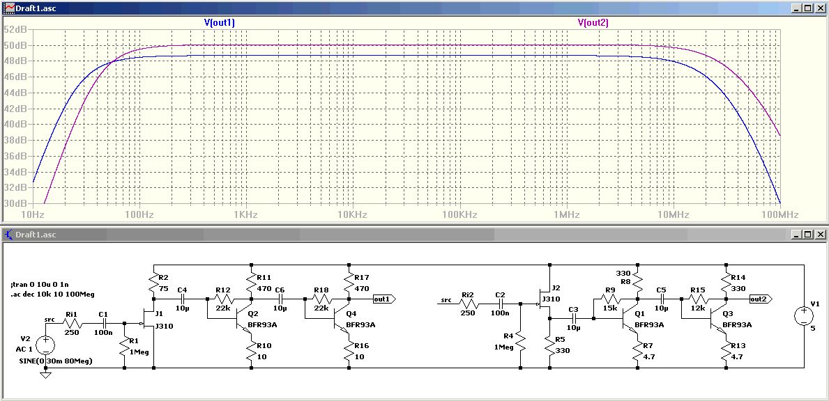 Hallo Bernd W, Kann Spice auch eine Darstellung der Verstärkung in Abhängigkeit von Amplitude und Frequenz des Eingangssignals darstellen? Hättest Du Lust und Zeit dazu? Die Schaltungen verhalten sich mit deinen Werten aus dem Spice Modell erstaunlich genau nach dem Modell. Bei 20 MHz muss ich aber schon mindestens 100 mV Signalstärke haben um am Ausgang ein sauberes Signal zu erhalten, sonst flattert schon die erste Stufe mit dem BFR92A ( Vishay). Hab den BFR 93 nicht parat. Danke