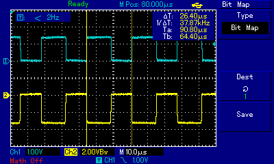 Hat jemand eine Idee, woran es liegen kann, wenn diese Schaltung nicht funktioniert? Ich habe einen ATTINY2313-20PU hergenommen und die main.hex geflasht... Was ich anders gemacht habe: -5V statt 3V Betriebsspannung -externen Quarzoszillator 8 MHz an Pin 5 (XTAL1) statt Keramikresonator -BC548C mit 470 Ohm an der Basis, im Kollektor 47 Ohm und die LED, parallel zur LED noch 470 Ohm (dann sehen die Ausschaltflanken besser aus...) Was ich getestet habe: -Pulse kommen an (siehe Bild), Kanal 1 ist Spannung über IR-LED und Kanal 2 ist Strom gemessen über 47 Ohm, also ca. 65mA peak -IR-LED leuchtet auch, Leuchten ist über Digitalkamera sichtbar -verschiedene Vorwiderstände an LED, etwas mehr Strom oder etwas weniger Strom ändert nichts -zwei verschiedene IR-LEDs probiert (etwas verschiedene IR Wellenlänge) -sichtbare LED blinkt (11 mal genau) Was nicht funktioniert: Fernseher (Philips) bleibt an. Habe ich zufällig einen Fernseher, dessen Code nicht drin ist? Was könnte sonst schief gegangen sein?