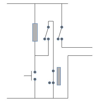 Korrektur: an der Spule des ersten Relais liegt die Oder-Verknüfung aus Taster und Und-Verknüpfung aus Selbsthaltekontakt und Schaltung.